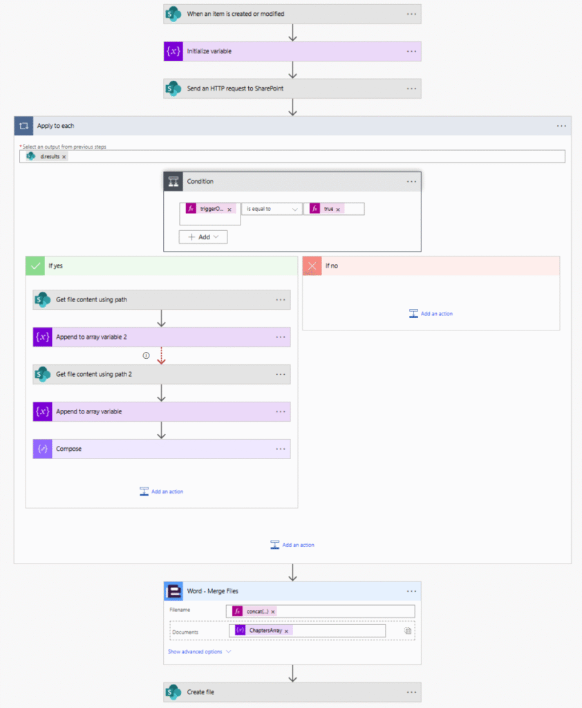 After working through some quirks in SharePoint list item parsing and content encoding, the final Power Automate flow: